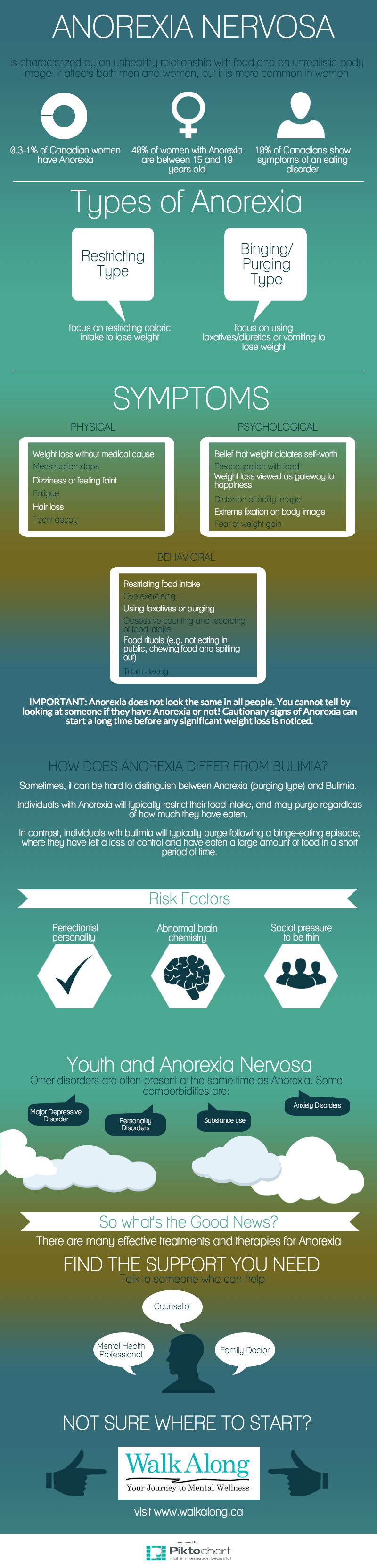 Click here to view the changes made in the DSM-V criteria for the diagnosis of Anorexia Nervosa. There are psychological, social and biological risk factors and causes for Anorexia. Individuals with other psychological disorders (especially substance abuse, depression, anxiety disorders and personality disorders) are at higher risk for developing an eating disorder. Treatment tends to involve both nutrition education and psychotherapy.